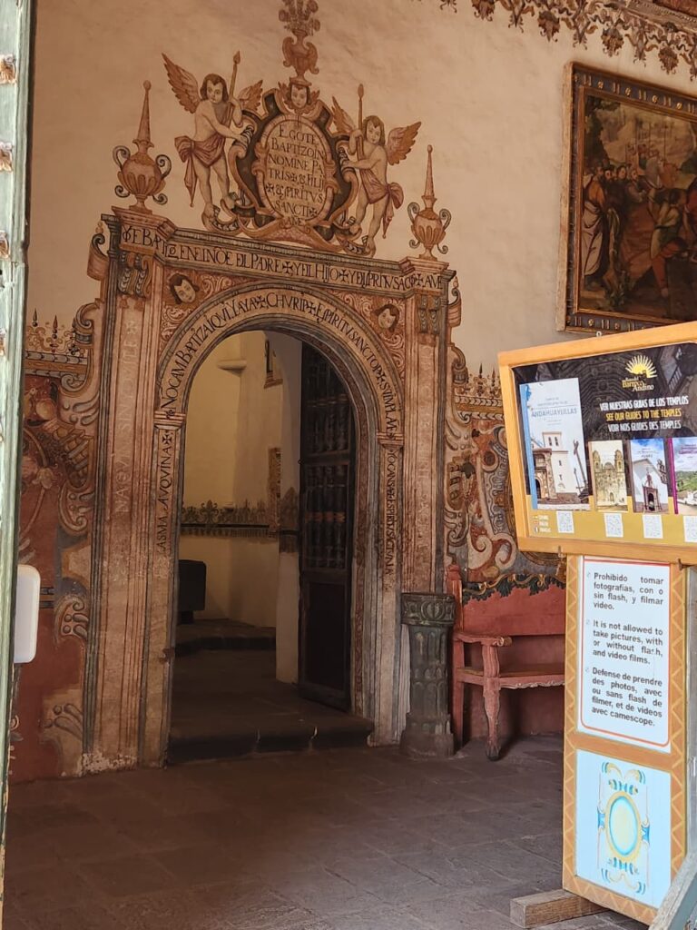 In the town of Andahuaylillas, near Cusco, the Church of San Pedro Apóstol is famous for its richly decorated Baroque interior—and for a remarkable detail on its baptistry entrance: a carved inscription of the baptismal formula “I baptize thee in the name of the Father, and of the Son, and of the Holy Ghost” written in five languages.